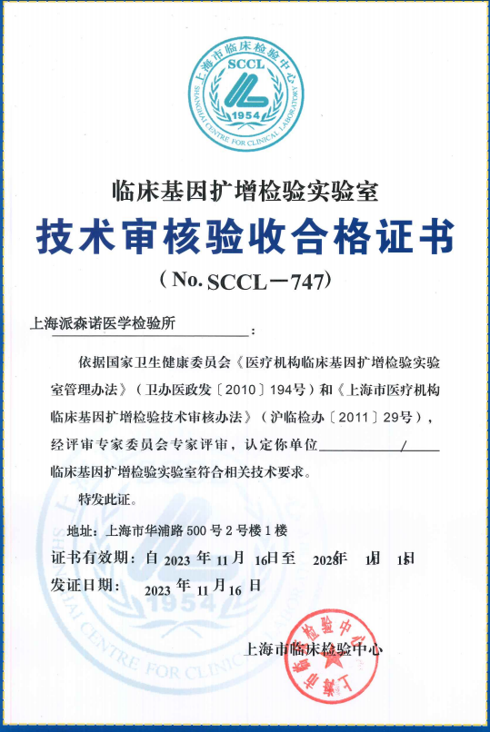 • 臨床基因擴增檢驗實驗室技術審核 驗收合格證書