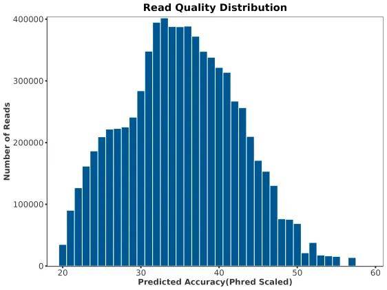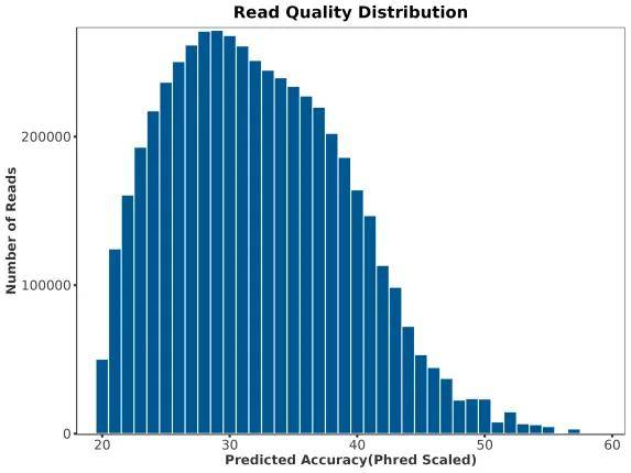 升級前,大多數reads平均質量值(Q值)集中在30左右,使用SPRQ試劑后reads平均質量值集中在35-40,高質量reads占比明顯增多,Q值達到38.56。