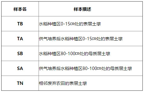 實驗設計:分別取水稻種植區0-15㎝處的表層土壤(TB)和80-100㎝處的母質層土壤(SB),以及相鄰廢棄農田的表層土壤(TN);對TB和SB分別進行供氣培養,分別命名為TA和SA。