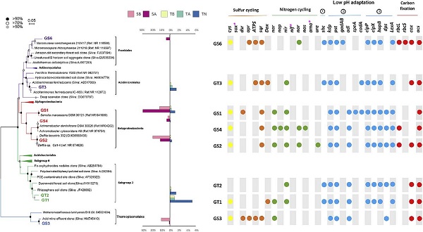 對高通量測序數據進行組裝拼接,并對拼接好的基因組序列進行物種和功能基因注釋,結果發現,注釋得到的菌群(主要有8種)參與了硫循環、碳循環、PH值降低操控、碳固定等代謝通路的調控,且隨著外界環境的變化可做出適應性的改變。