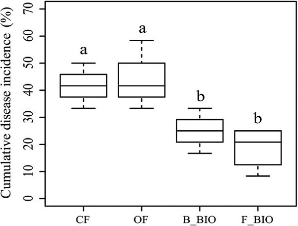 結果表明,接種了生防菌的生物有機肥組(B_BIO和F_BIO)的累計發病率顯著低于OF和CF組;OF和CF間無顯著差異。