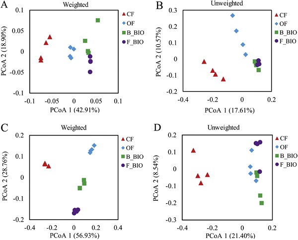 高通量測序結果顯示,在細菌菌群組成上,BIO與OF和CF組的菌群結構具有顯著差異;在真菌菌群組成上,OF和BIO組具有相似的菌群結構。在物種豐度上,屬于酸桿菌門的Gp6、Gp3、Gp4、Gp17和Gp1的相對豐度在OF和BIO中顯著大于CF組;OF和BIO中Lysobacter的相對豐度是CF的2.7-6.0倍;Chaetomium在OF中的相對豐度最高,而Fusarium在BIO中的豐度最低。ANOVA分析結果顯示,Bacillus在B_BIO中的豐度顯著高于F_BIO和OF,卻與CF相當;Trichoderma在四組樣品中未表現出顯著差異。