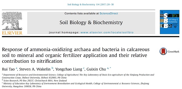 Tao, Rui, et al. "Response of ammonia-oxidizing archaea and bacteria in calcareous soil to mineral and organic fertilizer application and their relative contribution to nitrification." Soil Biology and Biochemistry 114 (2017): 20-30.