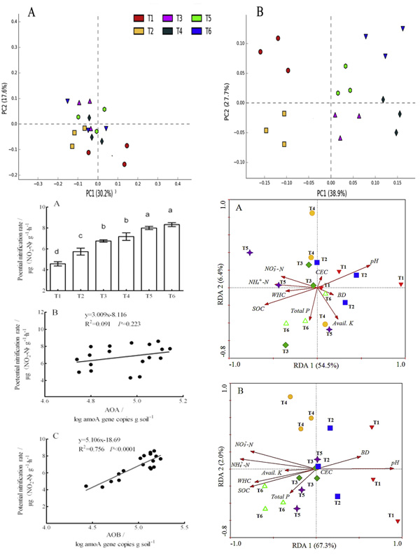 稀疏曲線和PCA分析結果均可表明,AOA的豐度及群落結構幾乎不受施肥處理的影響,而不同施肥處理對AOB的菌群結構具有顯著影響。土壤硝化速率測定結果顯示,無機肥和有機肥的施用顯著提高了土壤硝化速率;AOB的基因拷貝數與土壤硝化速率具有顯著相關性,AOA則無顯著相關性。RDA分析結果進一步表明,AOB與土壤生理生化特性(尤其是pH、NO3-、NH4+和SOC)聯系更為緊密。由此可見,AOB在石灰質土壤的硝化作用中占據主導地位。