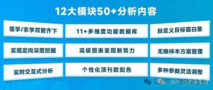 12大模塊50+分析內容,醫學/農學雙管齊下:覆蓋從數據質控、表達量預處理、差異分析到功能富集、聚類、通路可視化等全流程內容,分類清晰、邏輯明確、全面易懂,點點鼠標輕松完成復雜分析。