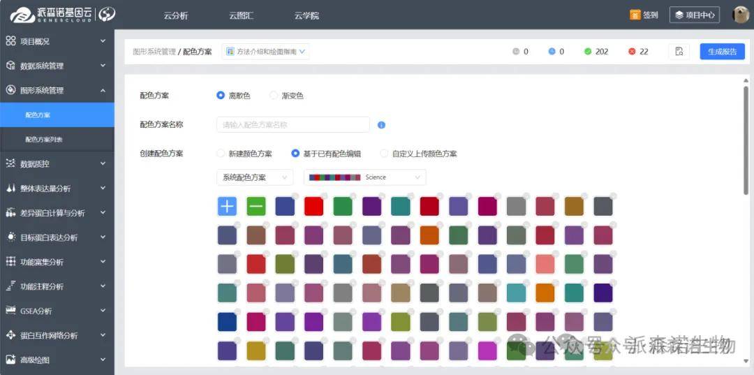 百組方案并行管理,頂刊圖表配色自由定制,您可通過頁面可視化點擊創建、基于已有方案進行修改拓展,或上傳自定義十六進制顏色代碼構建專屬配色,輕松實現平臺內所有圖形配色調整,提升結果展示的專業性與一致性,助力高水平科研成果產出。