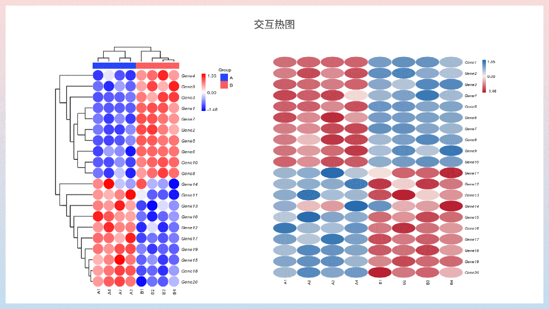 展示多個樣品之間的關系或相關性。顏色(紅色表示正值 / 藍色表示負值)越紅表示正相關越強,越藍表示負相關越強,可快速識別樣品間的相似性與差異性。