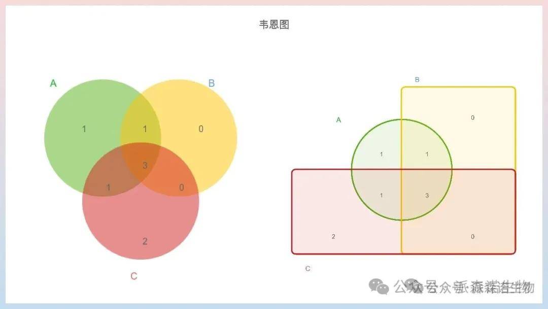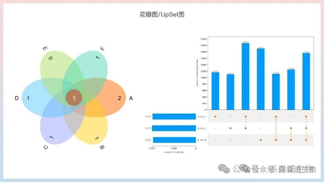 花瓣圖:適用于5個以上數據集的交集關系,中心區域顯示所有集合共有的元素數量,外圍花瓣代表各樣本獨有的元素數量。