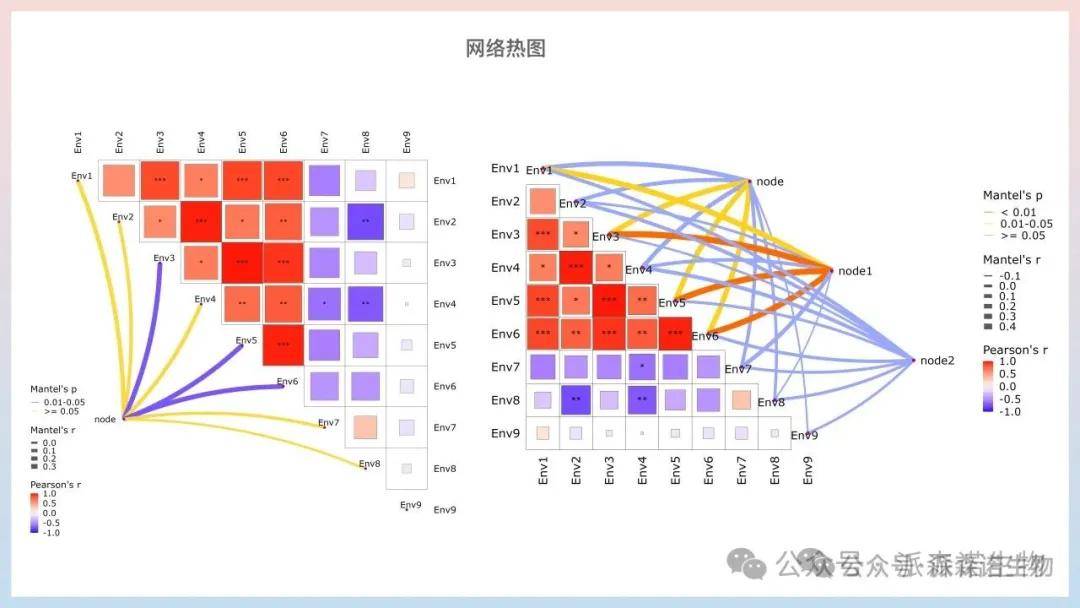 由熱圖和網絡圖組成,其中熱圖可展示組學內的相關性,而網絡圖可展示組學間的關聯性