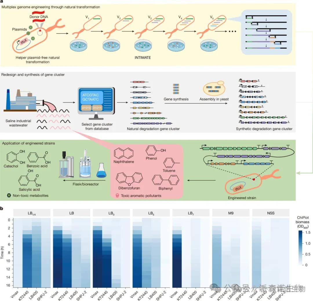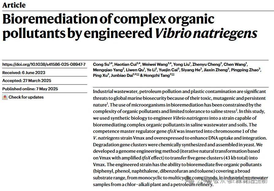 為了解決微生物的生物修復受限難題,亟需建立一株能夠修復一系列污染物的菌株。研究團隊篩選出需鈉弧菌作為底盤菌株,其在30-50g/L鹽濃度下生物量和污染物耐受性更高,轉錄組分析發現其外排泵及ABC轉運蛋白基因在污染物壓力下上調,增強排毒能力。通過整合tfoX基因構建VCOD-2,轉化效率提升且無抗性標記殘留。選定chr2_297為最優插入位點,構建的VCOD-3至VCOD-11中,5個菌株具降解能力。開發INTIMATE技術構建的VCOD-15,48小時內對5種污染物去除率超60%,在高鹽廢水和土壤中表現穩定,能高效降解污染物,且插入基因簇不影響生長,遺傳穩定。這些成果為應對全球海洋生物安全威脅提供了新的技術手段,在處理工業廢水、石油污染和塑料污染等領域具有重要的應用潛力。