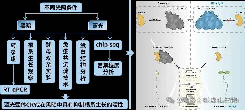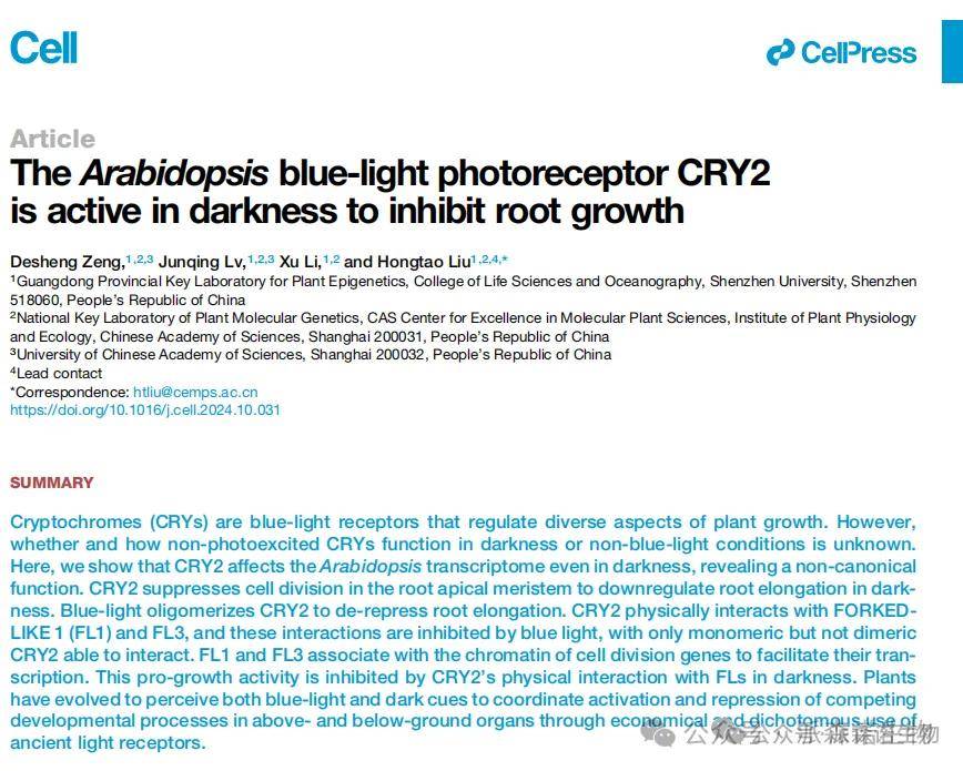 隱花色素(CRYs)作為一類藍光受體,但非光激發狀態的CRYs在黑暗或非藍光環境中的作用及其機制仍不清晰。通過轉錄組分析,研究團隊發現CRY2在黑暗中對基因表達的影響強于藍光下,且參與多種生物過程。表型分析顯示,黑暗中CRY2通過抑制根尖分生區細胞分裂及相關基因表達,抑制根伸長,藍光可減弱該作用。進一步研究發現,CRY2在黑暗中與FL1、FL3發生物理相互作用(藍光會抑制該作用),且FLs在藍光下通過促進細胞分裂基因轉錄促進根伸長。遺傳互作實驗表明FLs在CRY2下游發揮作用,CRY2在黑暗中抑制FLs與細胞分裂基因染色質的結合,藍光下該抑制解除,從而協調根系生長。