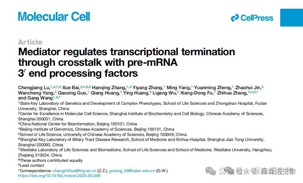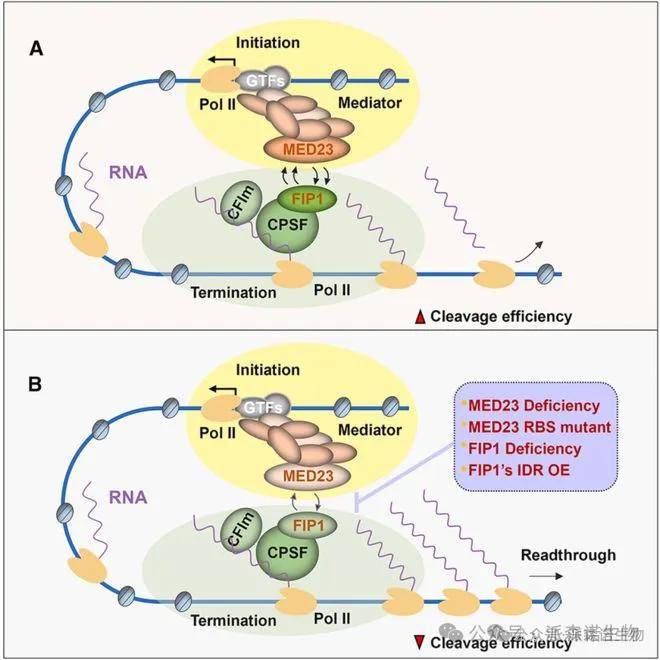 中介體復合物(Mediator complex)除了在轉錄起始中的作用外,還參與協調轉錄延伸和mRNA剪接過程。本研究揭示了中介體復合物通過MED23-FIP1的相互作用調控轉錄終止的分子機制。研究團隊發現,中介體復合物通過MED23與前體mRNA 3'端加工復合體CPSF中的FIP1結合,這種相互作用不依賴于RNA或DNA,且可能通過相分離實現。MED23是一種RNA結合蛋白,具有兩個RNA結合結構域,能特異性結合含CU-rich基序的3' mRNA。MED23或FIP1的缺失,以及FIP1特定片段的過表達,會破壞中介體與CPSF的關聯,導致轉錄通讀和融合轉錄本的產生,而MED23的RNA結合能力對此調控至關重要。此外,MED23在多種癌癥中表達降低,其缺失與乳腺癌中的轉錄通讀相關,可能影響癌癥進展和患者生存,為癌癥發生機制及潛在治療靶點提供了新見解。