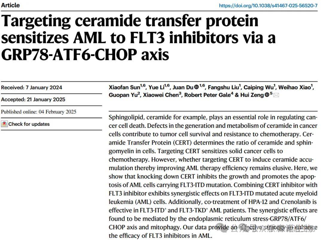 靶向神經酰胺轉移蛋白通過GRP78-ATF6-CHOP軸增強AML對FLT3抑制劑的敏感性
