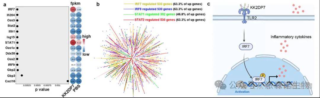 樹狀肽KK2DP7作為免疫調節肽衍生物,被選作模型佐劑以探索其通過訓練免疫增強抗腫瘤效應的機制。研究團隊發現,KK2DP7可通過誘導訓練免疫發揮抗腫瘤作用。在小鼠模型中,KK2DP7能顯著延緩腫瘤生長,延長生存期,且效果與已知訓練免疫激動劑β-葡聚糖相當,對多種腫瘤有效且無明顯毒副作用。研究證實,其作用依賴于脾臟,脾切除后抗腫瘤效果消失。進一步發現,脾臟非淋巴區的CD11b?細胞是關鍵靶標,該細胞經KK2DP7訓練后,會分泌特征性細胞因子,且增殖、吞噬和殺腫瘤能力增強,過繼轉移給naive小鼠可傳遞抗腫瘤能力。機制上,KK2DP7通過激活TLR2-IRF7軸,引發CD11b?細胞表觀遺傳重編程。