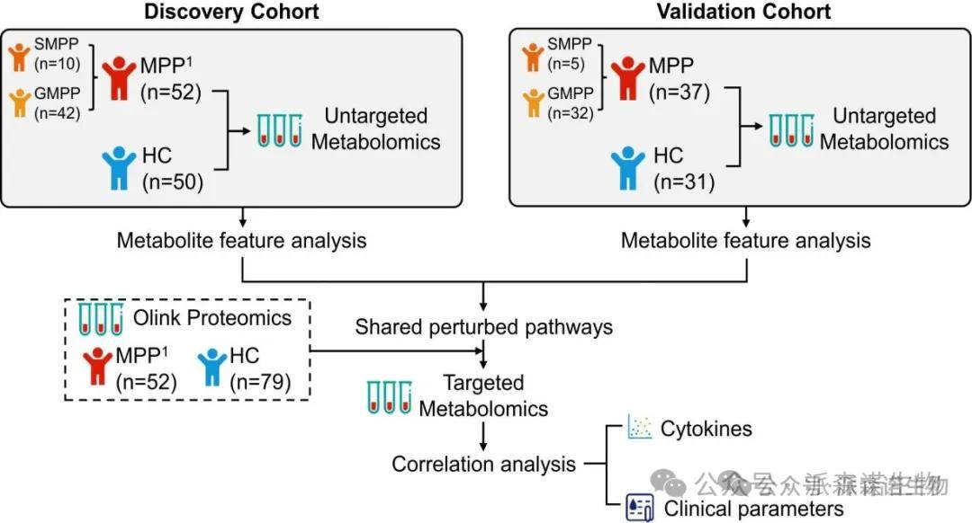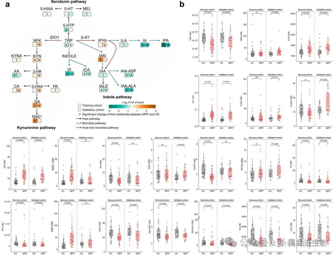 本研究采用兩大獨立隊列,結合非靶向代謝組學、Olink蛋白質組學和靶向代謝組學,重點解析TRP代謝通路。結果揭示MPP中TRP代謝的雙向調控特征:犬尿喹啉(KYN)通路上調促進炎癥,而吲哚通路下調削弱抗炎作用。研究提示靶向TRP代謝的治療潛力,并為免疫調節研究提供新方向。