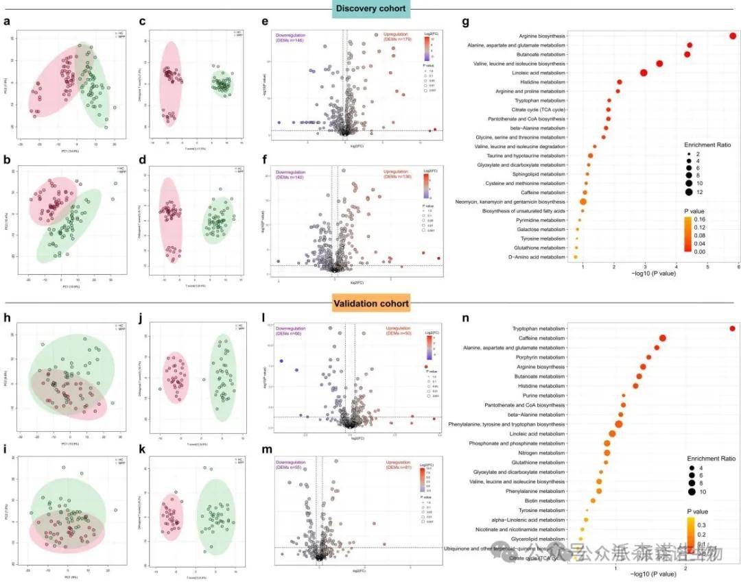 非靶向代謝組學分析揭示發現隊列和驗證隊列中MPP與HC之間的代謝差異