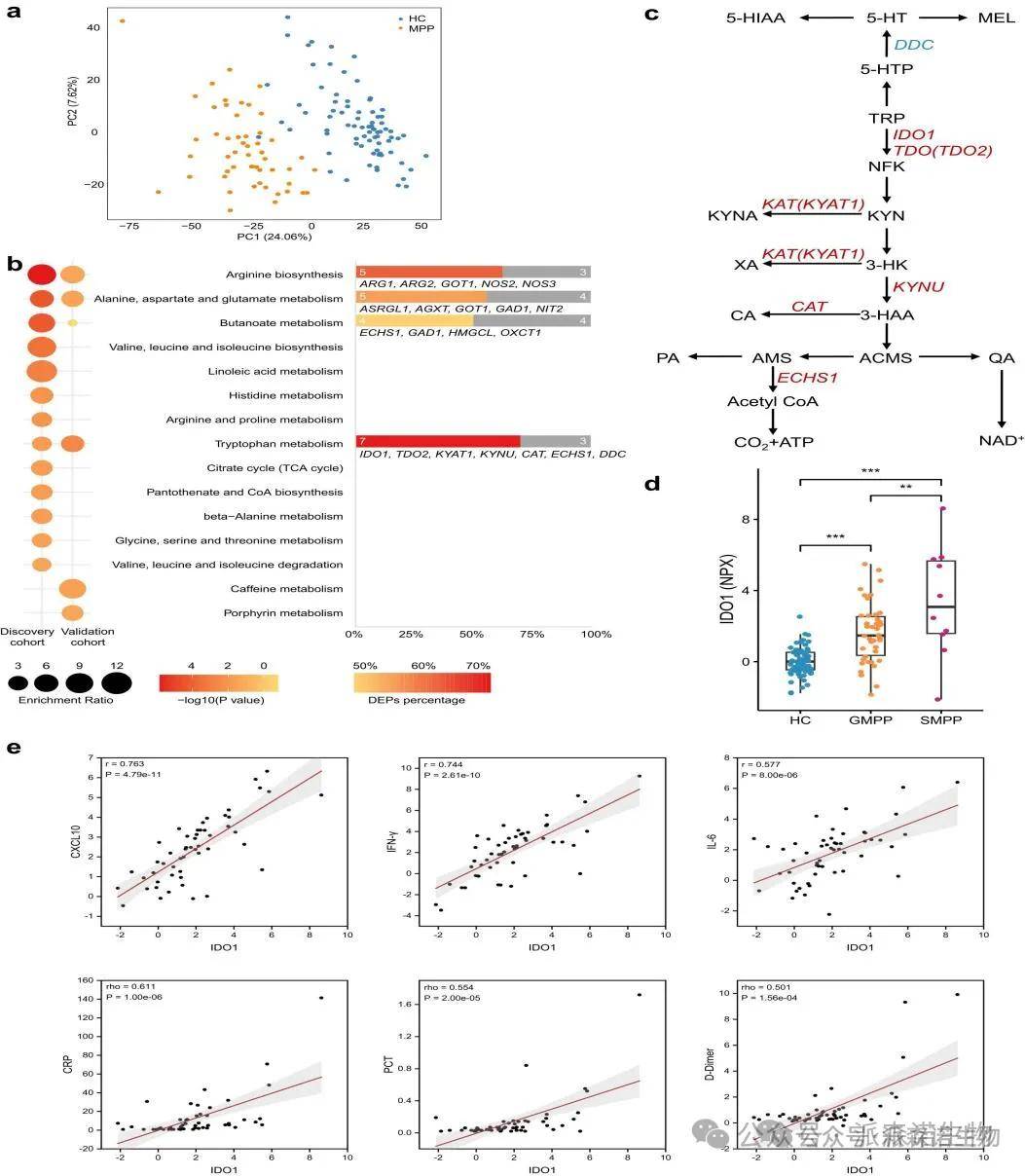 Olink蛋白質組學在52例MPP病例和79例HC中檢測到2884種蛋白質,其中2112種存在顯著差異,MPP組中1592種上調,520種下調。主成分分析(PCA)結果顯示MPP組與HC組之間顯著分離。非靶向代謝組學分析表明,四條通路在發現和驗證隊列中均受到影響:色氨酸代謝、精氨酸生物合成、丙氨酸、天冬氨酸和谷氨酸代謝、丁酸代謝。色氨酸代謝通路中,差異表達蛋白的比例最高(70.00%),顯示代謝酶顯著改變。色氨酸代謝主要分為犬尿喹啉、血清素和吲哚通路,其中IDO1在KYN通路中顯著上調,與疾病嚴重程度及炎癥相關指標(如CXCL10、IFN-γ、IL-6)呈強正相關。這表明色氨酸代謝在MPP中顯著改變,可能在免疫調節和炎癥反應中發揮重要作用。