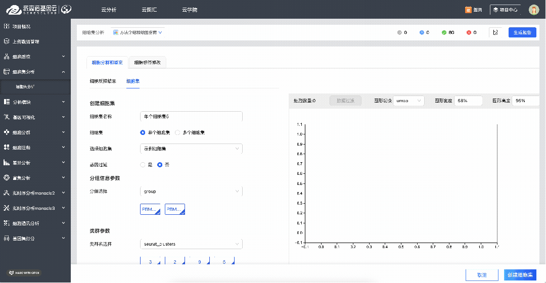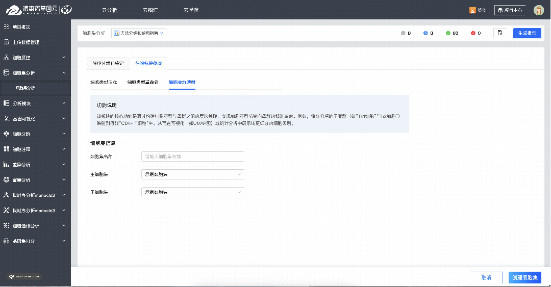 細胞集的創建是單細胞數據分析中的核心環節,細胞集創建分為兩大模塊,包含6種創建細胞集的方式,分別是基于細胞質控結果創建、單個細胞交互式框選創建、多個細胞集合并創建、細胞注釋標簽修改、細胞重命名、細胞亞群與母群之間的映射。通過以上方式,我們可以靈活創建細胞數據集。文章還將詳細說明功能頁面中的各項參數,以幫助科研人員更好地理解與使用本平臺。