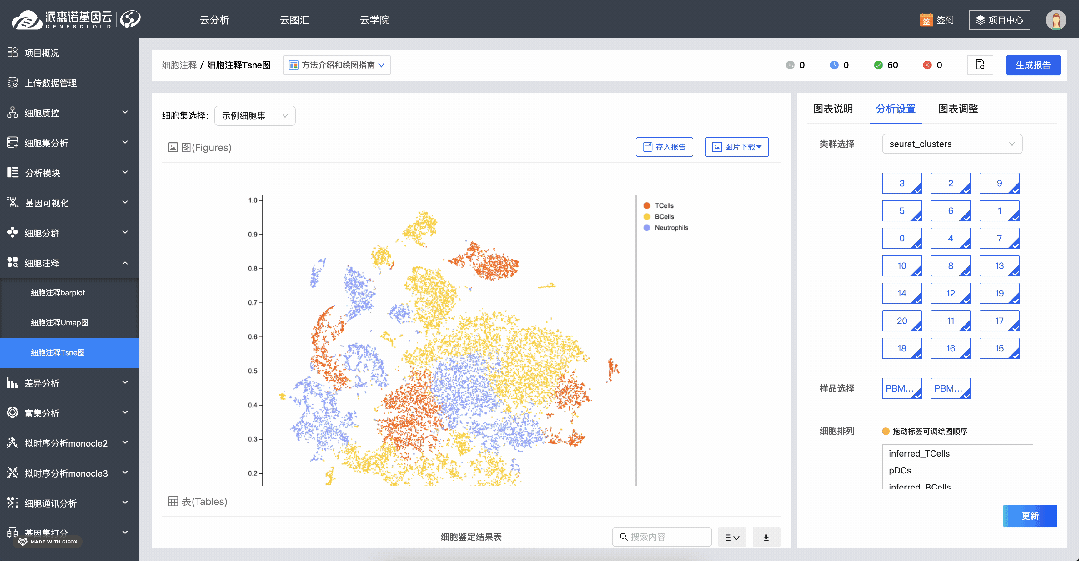 根據創建成功的細胞集名稱,通過下拉選擇可快速調取對應結果。從聚類分群圖譜(Umap/Tsne)、亞群注釋細胞注釋barplot圖,來展示細胞集結果分析可視化。