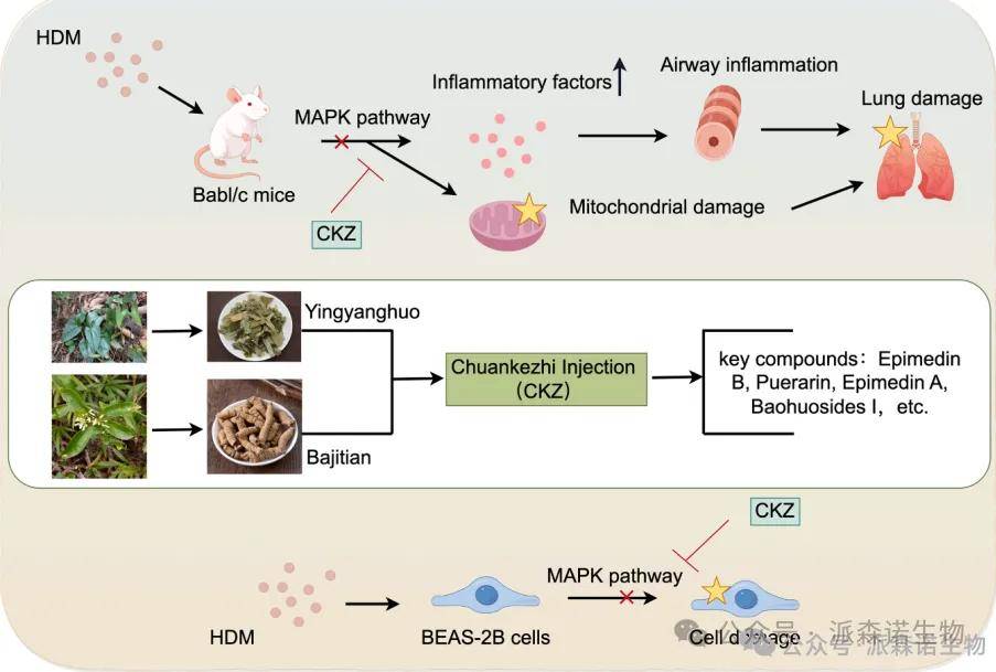 總之,本研究的數據表明,CKZ可以抑制小鼠HDM哮喘模型中的氣道炎癥,減輕肺支氣管上皮細胞的線粒體損傷,并抑制MAPK信號通路的激活,這可能有助于闡明CKZ在哮喘治療中的潛在調控機制。