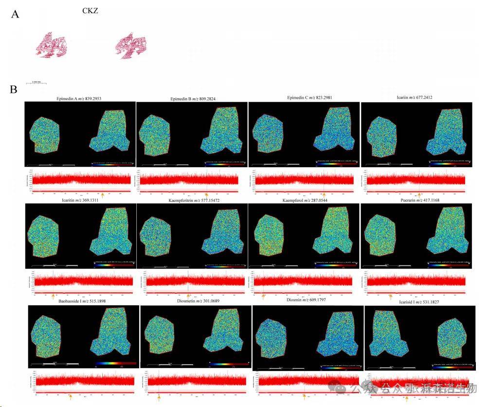 如圖2所示,MALDI-TOF的結果呈現了CKZ干預后小鼠肺組織中關鍵類黃酮化合物的原位空間分布。在這項研究中,MALDI-TOF在肺組織中成功檢測到了各種類黃酮,包括Icariin,Epimedin A,B和C等,這可能在氧化應激和炎癥調節中起重要作用。光譜中的主要峰分布在中等質量范圍內,這表明樣品中的類黃酮化合物具有相對濃縮的分布。