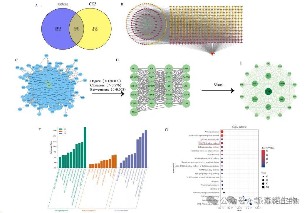 通過swiss目標預測篩選了1084個CKZ靶標,總共確定了638個重疊目標(圖3A)。如圖3B的網絡分析所示,將主要的藥物靶標和疾病進口到Cytoscape 3.9.0進行可視化,從而導致“組件 - 靶向疾病”網絡圖的構建,這表明它包含766個節點和4187個邊緣。值得注意的是,單個活性成分可能對應于多個靶標,并且不同的活性成分也可以共享相同的靶標,表明該藥物通過多型,多毒劑機制對疾病產生影響。如圖3C所示,將638個相交目標導入到字符串數據庫中進行分析,從而產生PPI網絡圖。該網絡包含638個節點和14,614個邊緣。按程度排名的前五個節點是TNF,AKT1,IL6,GAPDH和SRC,表明這些節點在PPI網絡中占據中心位置,并且具有密集的連接。表4顯示了前10個靶標。這些選定的基因靶標可能是藥物治療哮喘的核心靶標,藥物療效的機理可能與這些基因的表達有關(圖3D-E)。使用David數據庫,對靶基因的富集分析顯示了GO富集術語,其中包括與生物學過程(BP)相關的1425個,165個與細胞成分(CC)相關的術語(CC)和352個分子功能(MF),P <0.05。 BP項主要涉及細胞凋亡的陰性調節,細胞增殖的陽性調節,蛋白質磷酸化的陽性調節以及內皮細胞增殖的陽性調節。 MF項主要包括酶結合,受體結合和蛋白酶結合,而CC項主要涉及線粒體,蛋白質復合物和細胞內膜結合的細胞器。表5顯示了前十BP,CC和MF項,圖3F。結果暗示,治療哮喘的CKZ可能與以下BP高度相關:肽基 - 酪氨酸磷酸化,磷脂酶C激活G蛋白偶聯受體信號途徑,胞質鈣離子濃度的陽性調節,蛋白質自動磷酸化和蛋白質磷酸化。 CC術語側重于凋亡過程,受體復合物,膜筏,樹突和質膜外側的負調節。具有最高富集的MF術語主要涵蓋跨越蛋白酪氨酸激酶活性的非膜性的。