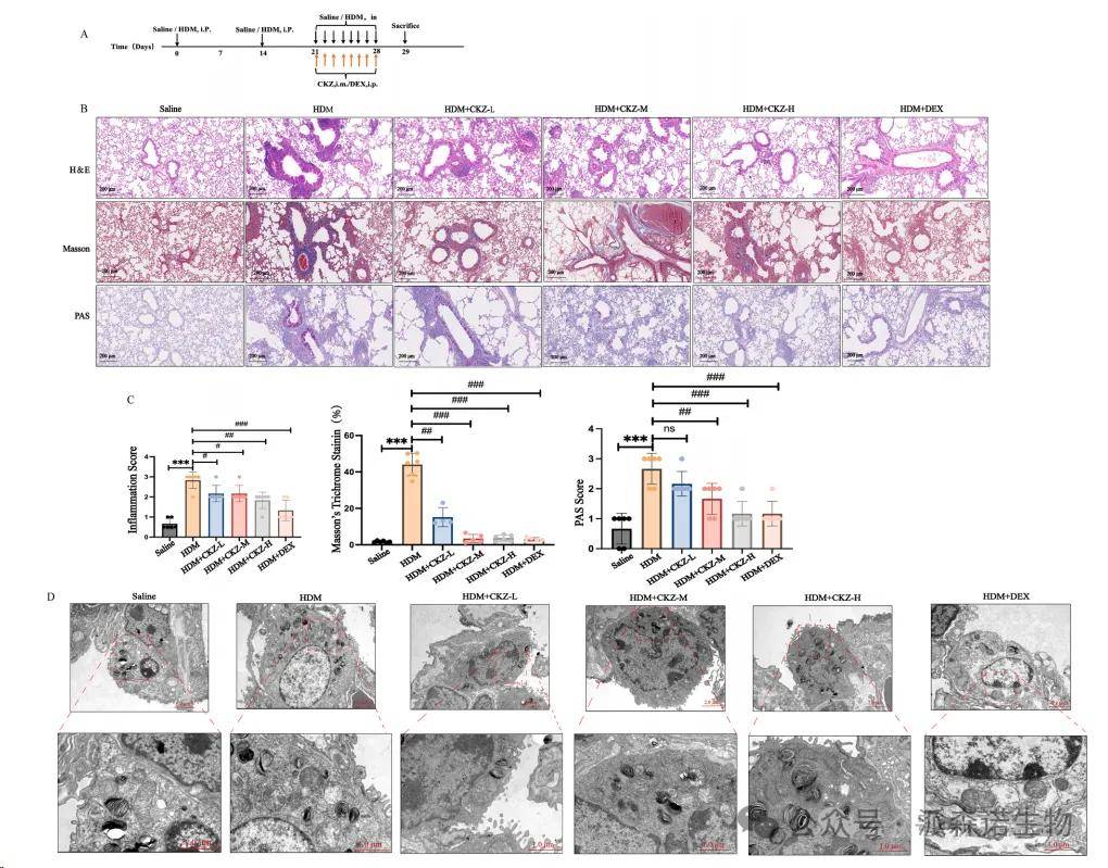 我們使用HDM來建立哮喘小鼠模型。(圖5A)支氣管壁增厚,炎癥細胞浸潤和杯狀細胞的增生是用于評估哮喘病理嚴重程度并代表哮喘的主要特征的關鍵標記。在肺組織中,H&E染色顯示周圍和周圍的周圍和周圍的周圍炎癥細胞浸潤增加,氣道上皮細胞脫離以及HDM誘導的哮喘的小鼠的粘液產生過多。模型組中可比的炎癥得分明顯高于對照組中的炎癥分數(p <0.001)。 CKZ在低,中和高劑量以及DEX(1 mg/kg)組中表現出顯著的抗炎作用。 CKZ治療顯著降低了炎癥細胞浸潤,上皮損傷和粘液過量產生,從而導致炎癥評分大大降低(P <0.001),表明與模型組相比恢復(圖5B和C)。與對照組相比,在哮喘模型的氣道上皮中,膠原蛋白纖維含量顯著增加,如Masson的三色染色所示(圖5B和C)。此外,通過CKZ和DEX的給藥可以明顯改善膠原蛋白纖維含量。 DEX管理似乎比CKZ更有效。PAS染色顯示模型組氣道上皮中的杯狀細胞(GC)增生,而對照小鼠中未觀察到這種變化。與對照組相比,模型組的標準化GC面積(圖6B和C)顯著增加(P <0.001)。然而,在CKZ和DEX組中,這種增加顯著降低(p <0.01)。這些發現表明,Ckzand Dex有效抑制了哮喘小鼠肺中的GC增生。這些結果表明,HDM誘導的哮喘導致肺組織的組織病理學變化。CKZ對減輕哮喘的組織病理學特征有明顯的影響。