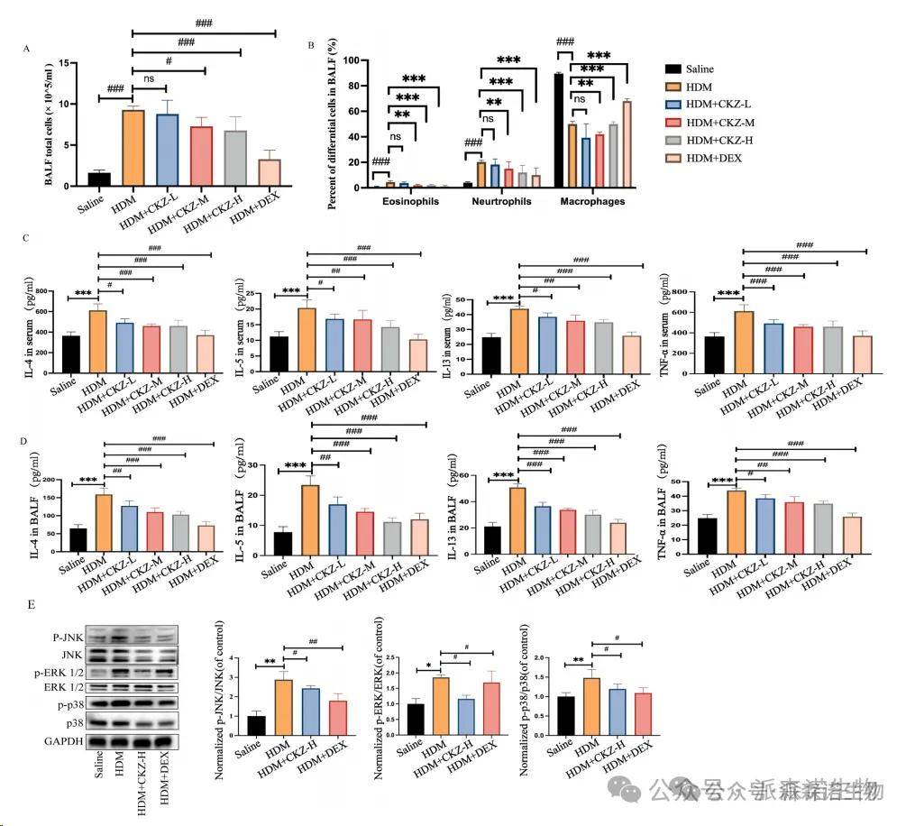 如圖6A和B所示,HDM誘導的小鼠BALF的總細胞和嗜酸性粒細胞的明顯升高相對于對照組。相反,CKZ和DEX給藥減少了總細胞和嗜酸性粒細胞計數。此外,在血清分析中,我們觀察到與鹽水組相比,我們觀察到2型炎癥因子(IL-4,IL-5,IL-13和TNF-α)的明顯增加,這是肺部炎癥的關鍵指標。 CKZ治療表現出降低炎癥因子水平的趨勢,表明其潛在的抗炎特性(圖6C)。此外,HDM挑戰還導致BALF內IL-4,IL-5,IL-13和TNF-α的顯著增加。顯然,與HDM組相比,CKZ和DEX處理都大大降低了BALF炎癥性細胞因子的表達(圖6D)。根據先前的結果,MAPK信號傳導是CKZ介導的最重要的途徑之一。在由HDM誘導的哮喘小鼠的肺組織中,相對于對照組中的JNK,ERK和P38的磷酸化水平增加,CKZ和DEX的處理有效地降低了磷酸化的JNK,ERK和P38的水平,導致MAPK Signalk Signalk Signalking Pathway的抑制(圖6E)。