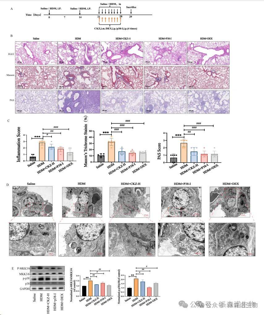 基于上述結果,我們進一步探討了使用p38 MAPK抑制劑(p38-i,SB 203,580)以及CKZ對p38途徑的抑制作用(圖7A)。 HE,Masson和PAS染色的結果初步表明,使用p38抑制劑可以顯著改善哮喘誘導的肺損傷(圖7B-C)。對TEM結果的進一步分析還表明,阻斷p38途徑可以減輕肺組織中的線粒體損傷(圖7D)。進一步的蛋白質印跡結果表明,CKZ-H(高劑量)可以抑制p38途徑的關鍵蛋白(P-MKK3/6,P-P38)的磷酸化,這可能是CKZ發揮其抗炎作用的關鍵途徑之一(圖7E)。