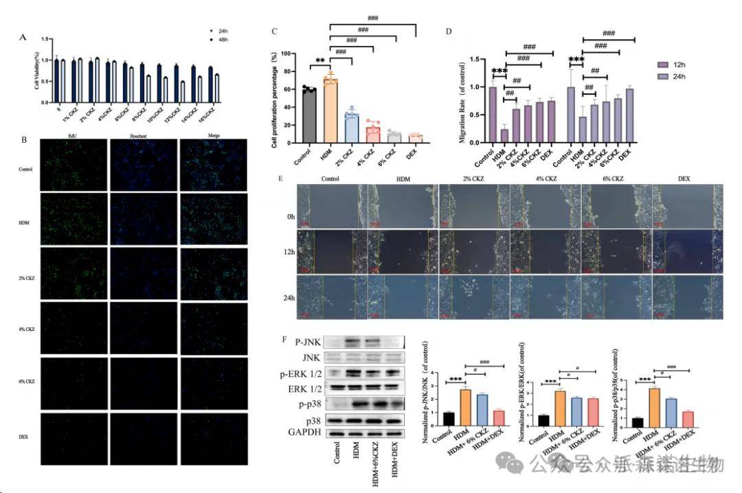 為了評估CKZ在24小時48小時內誘導的細胞毒性,測量了細胞活力。在CCK-8測定中,在24小時和48小時治療后,CKZ濃度分別為16%,細胞活力分別為57.58%和55.43%,并且未降至50%以下。根據結果,確定細胞活力超過80%的濃度范圍為2%至8%。因此,建議將8%作為后續實驗的安全劑量。 (圖8a)EDU測定進行EDU測定以評估細胞增殖。使用熒光顯微鏡定量EDU陽性細胞的百分比。在HDM組中,與對照組相比,觀察到EDU陽性細胞的數量顯著增加,表明細胞增殖增強。相比之下,CKZ(2%,4%,6%)和DEX組的增殖速率低于HDM組和對照組,而6%CKZ組和DEX組對細胞增殖表現出最強的抑制作用。 (圖8b和c)另外,通過傷口愈合測定法評估了細胞遷移,我們在0 h,12 h和24 h時測量了刮擦寬度,以比較差異。暴露于HDM(模型組)的BEAS-2B細胞在12 h和24 h時表現出比對照細胞差異更嚴重的(p <0.001,圖8D和E)。與HDM處理的細胞相比,CKZ治療(2%CKZ,4%CKZ,6%CKZ)和DEX治療都顯著改善了愈合區域的細胞遷移,而HDM處理的細胞在12 h和24 h(p <0.01,p <0.01,p <0.01,p <0.001和p <0.001和p <0.001均分別為p <0.001和p <0.001,圖8D和e)。