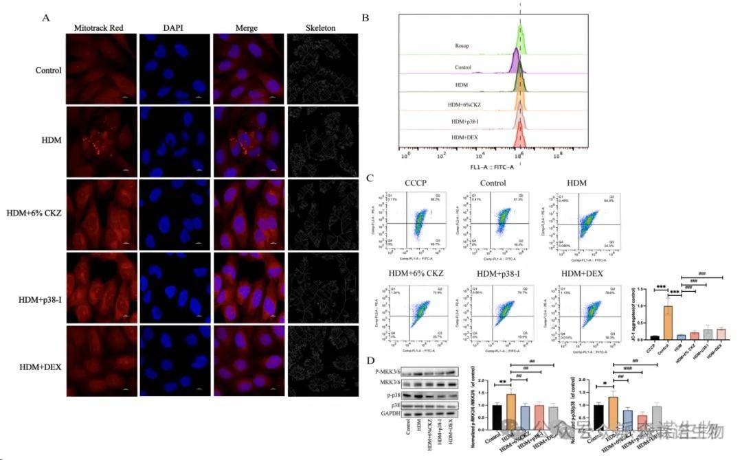 哮喘患者的氣道上皮細胞在接觸過敏原、空氣污染物、炎癥介質時可能會出現線粒體功能障礙。這可能導致線粒體膜電位降低,活性氧(ROS)產生增加,細胞能量代謝紊亂。BEAS-2B細胞用Mito Tracker Red染色。使用共聚焦顯微鏡捕獲線粒體圖像,隨后用ImageJ軟件進行分析和骨架化。結果清楚地表明,HDM治療導致線粒體分支長度減少,導致線粒體斷裂;6%的CKZ、P38-I(SB 203580)和DEX治療都有助于恢復線粒體網絡(圖9A)。DCFH-DA的流式細胞術分析顯示,HDM提高了細胞ROS的產生(圖9B)。相比之下,CKZ、P38-I(SB 203580)或DEX治療顯著減少了HDM誘導的ROS積累。JC-1染色的流式細胞術分析表明,HDM治療加重了MMP的損失,而CKZ、P38-I和DEX對HDM治療的BEAS-2B細胞中的線粒體具有保護作用(圖9C)。這些發現表明,CKZ不僅保護線粒體,而且具有抗凋亡作用。