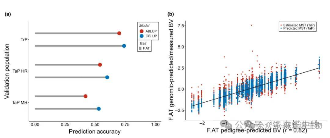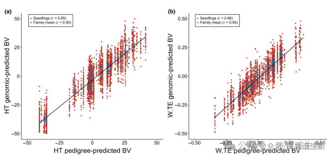 利用經過驗證的GBLUP與ABLUP模型,對TaP(測試群體,Test Population)的樹高和木材總提取物進行了預測。將GBLUP預測結果(包括單株幼苗及其家系平均的基因組育種值)與ABLUP預測結果比較后發現:GBLUP能夠計入孟德爾抽樣誤差,從而捕捉到巨大的家系內變異。家系平均GBLUP預測值與ABLUP預測值的相關性(樹高r = 0.90,木材總提取物r = 0.95)高于單株GBLUP預測值與ABLUP的相關性(樹高r = 0.85,木材總提取物r = 0.86)。此外,GBLUP與所有測試的貝葉斯模型在兩個性狀上的相關性都非常高。