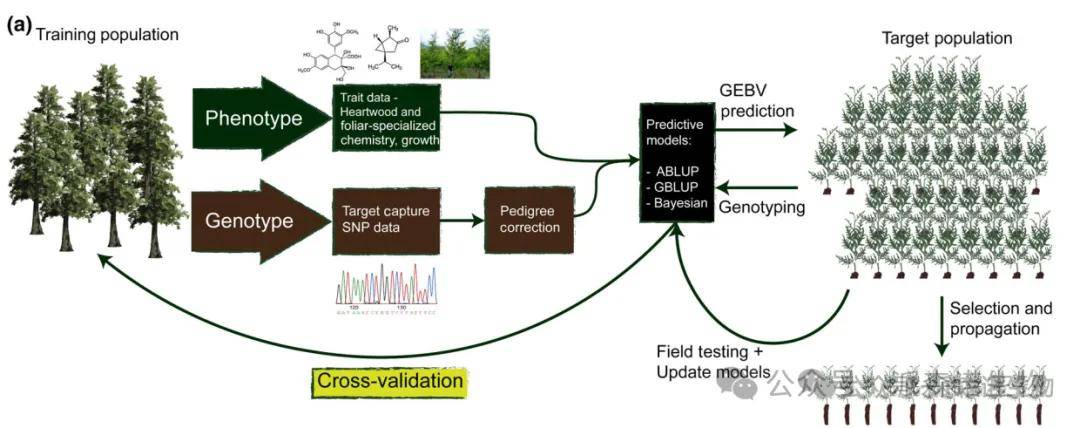 自然環境中,森林資源面臨著諸多威脅。傳統育種方法可能過于緩慢,無法培育出適應性強的樹木,但基因組選擇(GS)可以加速這一過程。研究人員描述了一項關于西部紅柏從概念驗證到實際應用的全面基因組選擇研究。利用基因組數據,研究人員在樹木訓練群體(TrP)上開發了模型,用于預測目標幼苗群體(TaP)的生長、心材化學和葉片化學性狀的育種值(BVs)。同時使用交叉驗證來評估TrP中的預測準確性(PACC);同時也在TaP中驗證了早期表達葉片性狀的模型。