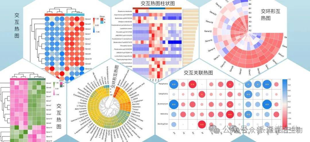 ①交互熱圖:二維矩陣可視化,用顏色深淺表示數值大小,適合展示高維數據矩陣(如基因表達矩陣);