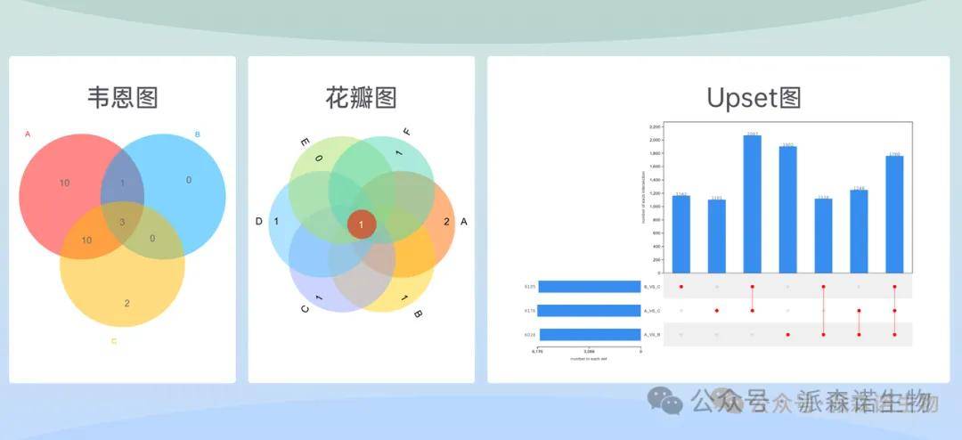 3款維恩圖系列:根據集合數量的多少,可依次選用韋恩圖、花瓣圖與UpSet圖,以清晰展示數據集之間的交集與特有關系。