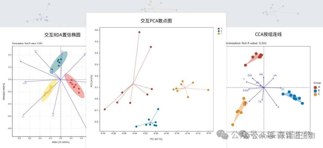 3款降維分析圖:從單純看數據分布(交互PCA),到引入環境因素并量化線性影響(交互RDA),再到處理更復雜的非線性關系(CCA),要強調這是方法上的進階。