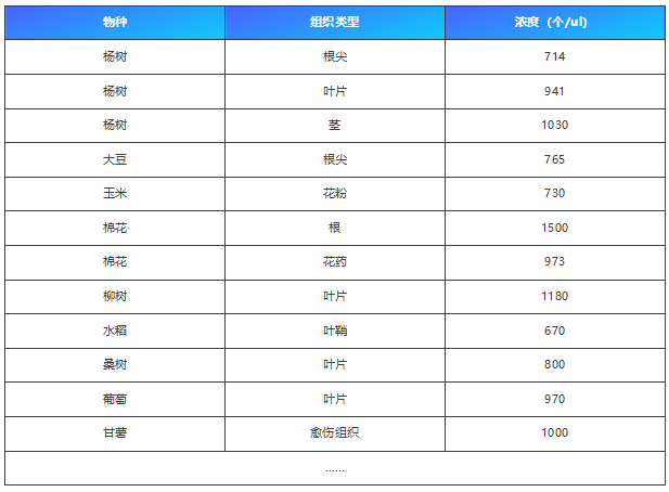 派森諾單細胞平臺已成功完成5000+單細胞樣本測序,有著豐富的項目經驗,以下是部分派森諾曾做過的植物組織抽核樣本類型: