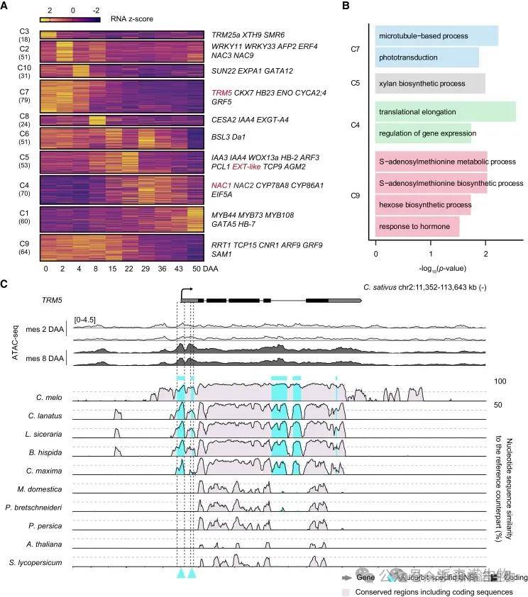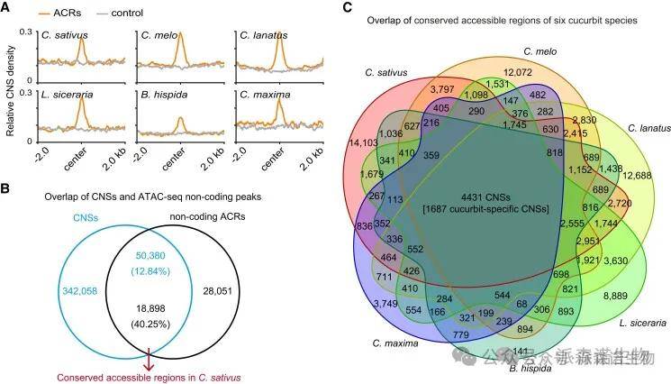 結合ATAC-seq和RNA-seq分析,定位了20,865至43,204個可及染色質區域(ACRs),這些區域與基因表達正相關,并表現出組織和階段特異性。整合分析發現4,431個共線同源CNSs與ACRs重疊,其中1,687個為葫蘆科特有,推測它們通過調控757個相鄰基因參與早期果實發育。