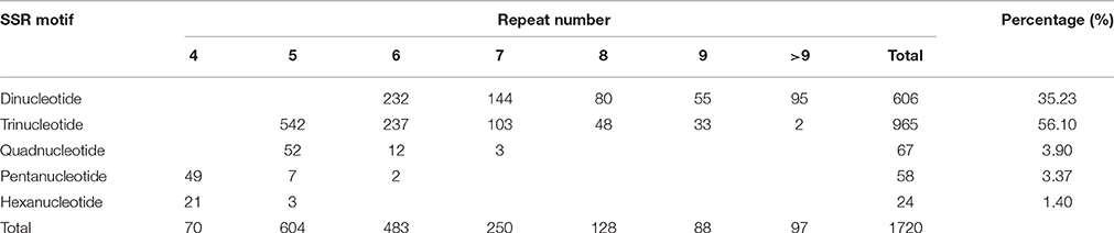 在亞麻基因組中共鑒定到1720個SSR位點,其中有1574個SSRs是新發現的。SSRs motif類型主要以三堿基重復(56.1%)和二堿基重復(35.23%)為主(表1)。