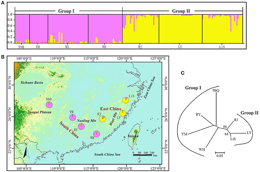 圖3 基于14個EST-SSRs的毛花獼猴桃進化樹構建及群體結構分析