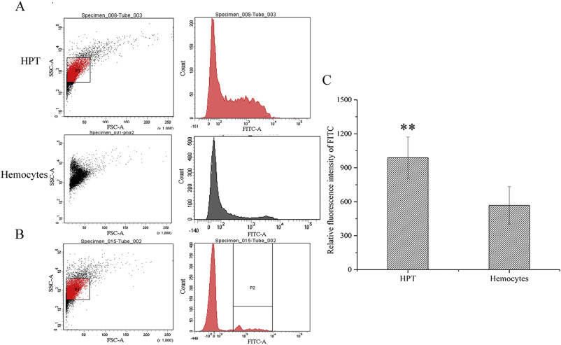 氧化還原系統在維持干細胞的自我更新和分化方面起著重要的作用。活性氧(ROS)是由氧代謝產生的,在許多過程中,如癌癥、心血管疾病和衰老,都被牽涉其中。越來越多的研究揭示了ROS在血液生成中重要的調節作用。HPT和血細胞中通過流式細胞儀均檢測到ROS陽性信號,但是HPT中ROS的陽性率明顯高于血細胞(如圖1A和1C)。HPT細胞對于直徑為2μm的乳膠微球的吞噬能力為8.2%(如圖1B)。HPT細胞具有吞噬細胞的能力被證明,這表明在成熟前,血細胞前體細胞可能發生了功能性分化。