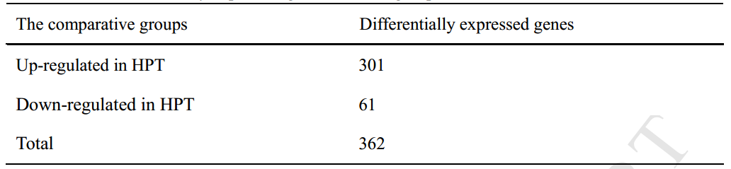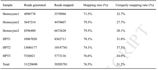 對HPT和血細胞進行轉錄組測序,得到如表1和表2所示數據。對測序后的數據進行GO注釋(圖2)HPT和血細胞比較,共有362個差異表達基因(圖3),其中301個在HPT中上調,61個在血細胞中上調。 這三百六十二種不同表達的基因,其中一些可能是HPT和血細胞的標志性分子。301個在HPT中上調的基因成功富集到50個KEGG信號通路上,例如嘌呤代謝,嘧啶代謝,賴氨酸生物合成,組氨酸代謝,花生四酸代謝,脂肪酸生物合成,檸檬酸循環(TCA循環)和氧化磷酸化等。61個在血細胞中上調的基因主要富集到了七個KEGG通路,其中一個是酪氨酸代謝途徑,這表明了在血細胞中有獨特的酚氧化酶激活系統。此次的轉錄組數據為進一步研究血細胞生成機制和開發潛在的分子標記物提供了資源。