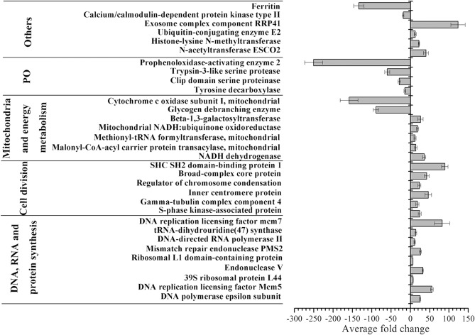 如圖4所示,HPT和血細胞32個差異表達基因可分為DNA、RNA和蛋白合成,細胞分裂,線粒體和能量代謝,酚氧化酶激活系統和其他五類。這一結果也符合造血干細胞在分裂和分化過程中需要大量的DNA、RNA和蛋白質。對這些基因進行QPCR驗證,結果和轉錄組測序結果一致。
