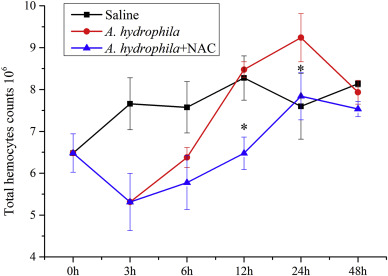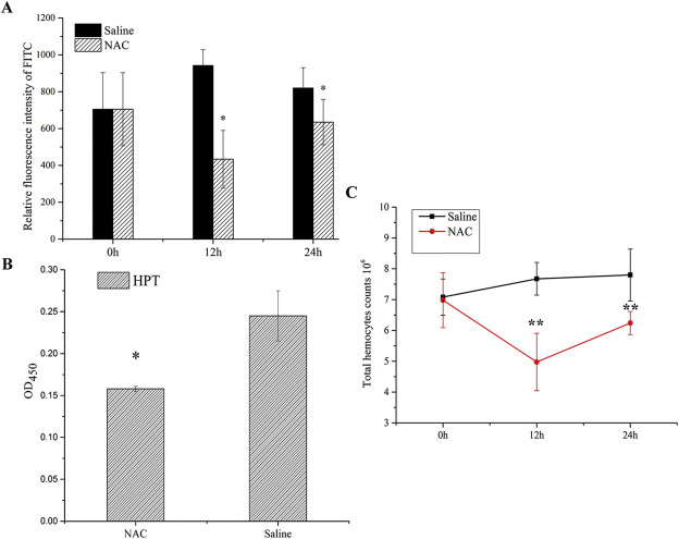 為了進一步證明ROS和造血功能之間的關系,對120只中華絨螯蟹隨機分成3組,第一組注射生理鹽水,第二組注射嗜水氣單胞菌,第三組注射嗜水氣單胞菌和NAC,然后統計THC的值。圖6表明注射NAC可以抵消注射嗜水氣單胞菌導致的THC增加的效果,使其恢復正常值。總結就是:經NAC對ROS進行了清除后,HPT細胞的相對存活能力顯著降低,同時,紅細胞總數也減少。更重要的是,NAC可以顯著降低由細菌刺激引起的血細胞總數的增加。這些結果共同證明了ROS信號對血細胞釋放的重要性。