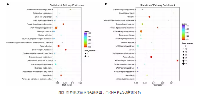 將差異表達lncRNA,circRNAs,miRNAs的靶基因,以及差異表達lncRNA,miRNAs共有的靶基因,分別進行GO和KEGG富集分析。通過共表達,共位置分析預測的DE lncRNAs靶基因顯著富集到發育過程(biological process,BP),細胞膜囊泡(cellular component,CC),結合(molecular function ,MF)等GO terms上;DE miRNAs的靶基因主要富集到定位(BP),具膜細胞器(CC),結合(MF)等GO terms上;DE lncRNA,DE miRNAs共有的靶基因主要富集到發育過程(BP),細胞膜(CC),蛋白結合(MF)等GO terms上。DE lncRNA,DE miRNAs共有的靶基進行KEGG富集分析,結果表明核糖體,PI3K-Akt信號通路等代謝通路顯著富集,可能參與到坐骨神經痛發病機理過程。
