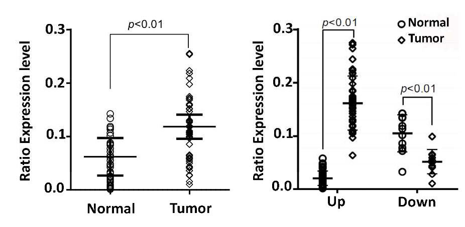 利用qRT-PCR驗證結直腸癌樣本和其他相關組織中GPRC5A的表達水平,結果發現與正常組織相比,結直腸癌樣本中GPRC5A的表達水平顯著提高。之后分別取結直腸癌病人中的癌癥組織和正常組織,驗證發現,46個病人中癌癥組織GPRC5A的表達量顯著高于正常組織。
