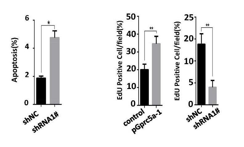 敲除GPRC5A會抑制結直腸癌細胞增殖和群體形成,但是會促進細胞凋亡。GPRC5A的高表達與結直腸癌腫瘤的惡性程度成正相關并且可以通過抑制氧化應激的過程來阻止人或小鼠模型中結直腸癌的過程。