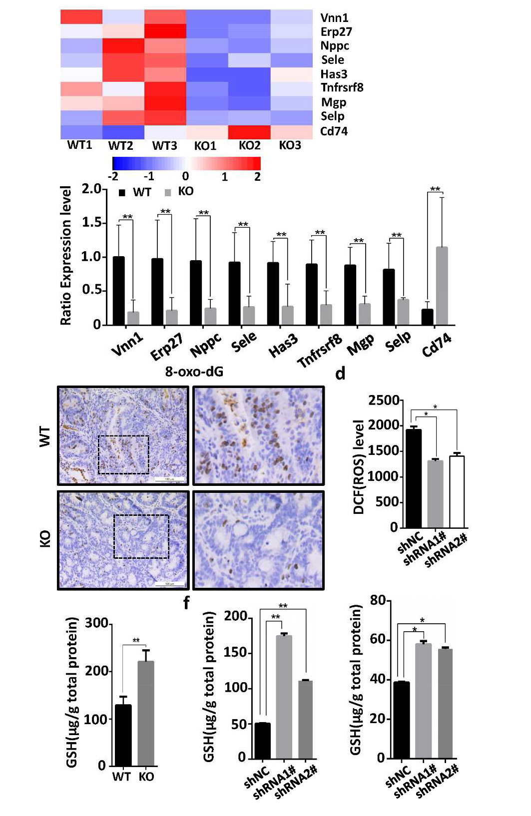 利用轉錄組高通量測序技術發現了大量氧化應激相關基因的特異性表達,例如NPPC、NAC、Selp、Sele和Erp27等。圖4d-f中所展示的GSH水平增加以及ROS減少表明,敲除GPRC5A的癌細胞中靶基因異常表達,從而證明該組織中氧化應激減少。利用轉錄組測序發現的相關基因都是氧化應激基因應答的下游基因,推測Vnn1是GPRC5A基因表達的主要下游基因。GPRC5A缺陷的細胞和小鼠組織,相關基因和蛋白質水平下調。綜上所述,GPRC5A通過調節VNN1水平抑制細胞氧化還原狀態。