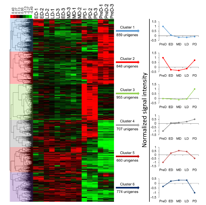 五個發育時期(PreD,ED,MD,LD,PD)的組間兩兩比較共發現4808個顯著差異基因,校正之后共發現3290個差異基因,這些差異基因主要分布在內分泌系統和消化系統中的代謝和信號轉導相關通路中,利用表達模式的不同將這些差異基因分為六類,其中一類和三類中的基因在PreD和PD兩個時期中高表達,四類中的基因在PreD時期中高表達。