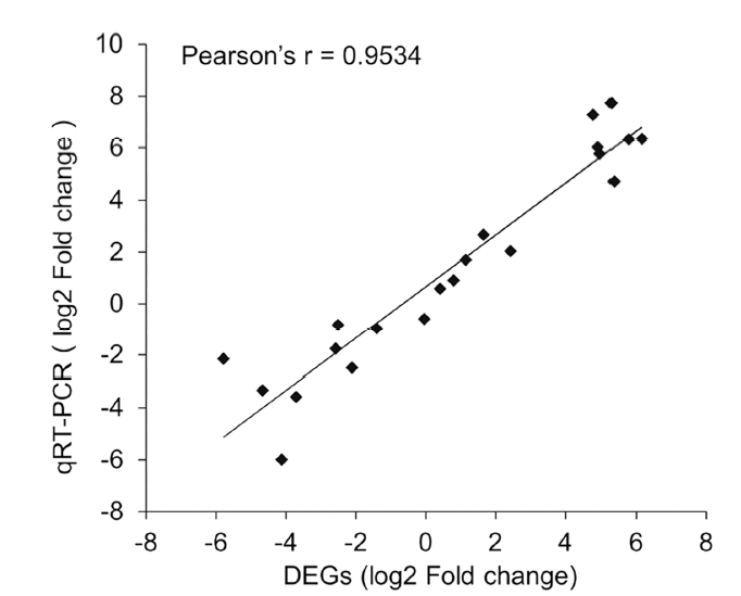 本研究挑選21個差異基因進行qRT-PCR驗證,將qRT-PCR數據與轉錄組數據比較,發現他們之前相關性很高,結果證明了轉錄組數據真實可信。